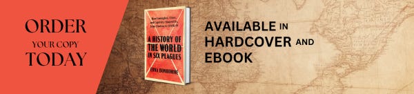Last year, I published A History of the World in Six Plagues. Please recommend the book to relatives, coworkers, pen pals, editors, or loved ones. You can also order the book at your local bookstore or library. Consider leaving a positive review of my book on Amazon, Bookshop, or Goodreads, or sharing positive thoughts about it on social media.